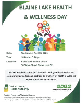 Health & Welness Day Posted onMarch 26, 2026AuthorClerk BlaineLake April 15, 2026Health & Welness Day10:00 am - 3:00 pm Blaine Lake Seniors Center Map