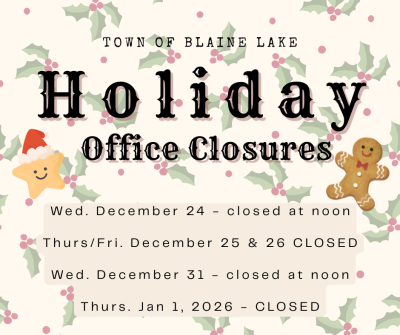 The Town Office will close at 12:00 noon on Christmas Eve Blaine Lake Town Office BINGO @ Seniors Center from 7:00 pm to 9:00 pm