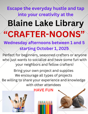 Blaine Lake Library. Bring your own project and supplies. Enouraging all types of projects. For beginners and seasoned crafters. Come have some fun!