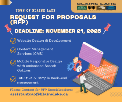 Town Seeking Responses to Request for Proposals (RFP) Posted onNovember 12, 2025November 12, 2025AuthorClerk BlaineLake If you would like to submit a proposal for services, please respond to: assistantcao@blainelake.ca